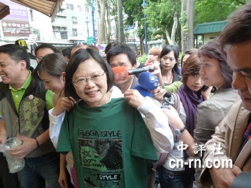 据中评社报道,民进党主席蔡英文昨天到台北市著名服饰批发市场─五分埔商圈扫街拜票,除呼吁支持者在家等民调电话,顺道捧场买了一件新台币380元的正绿色T恤。老板看到蔡英文比来比去,东瞧瞧、西看看,连忙说要送她,蔡英文直说不行,坚持要用买的。