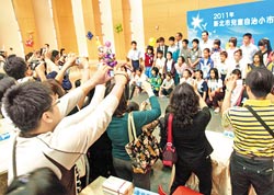 新北市政府29日举办大市长与小市长的高峰对谈,小市长会后与大市长朱立伦合影,台下小市长的爸爸、妈妈们,则拿着相机抢着为儿女留下这值得纪念的一刻。图片来源:台湾《中国时报》