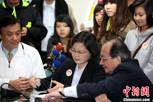 3月23日,民进党主席蔡英文(中)来到台北民进党中央党部,领表登记参加2012台湾当局领导人选举民进党党内初选。中新社发 董会峰 摄