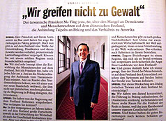 德国《明镜》周刊4月下旬在台北专访马英九,谈两岸关系的发展、“台美中三边关系”及亚洲的新形势。