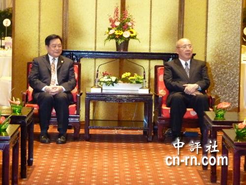 国民党荣誉主席吴伯雄(右)22日晚间宴请四川省长蒋巨峰(左)。图片来源:香港“中评社”