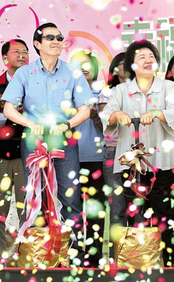 高雄六龟温泉与农特产业嘉年华系列4日举行开幕仪式,马英九(左)与高雄市长陈菊(右)一起加油集气,释放梦想气球为活动揭开序幕。图片来源:台湾《中国时报》