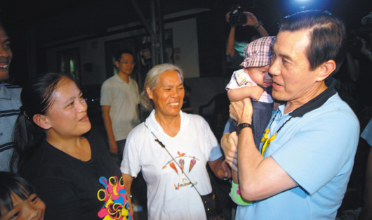 马英九(右)经过大社部落时,特别探视风灾两年后大社部落的第一个新生儿陈琳。图片来源:台湾《联合报》