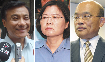 蔡英文(中)副手人选,“双苏”苏贞昌(右)、苏嘉全(左)浮上台面。图片来源:台湾《联合报》