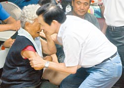 昨天,马英九来到台南台风重灾区恒春镇慰问灾民,一老人谈到水淹家园时,不禁泪流满面,马英九当即给予一个温暖的拥抱。图片来源:《中国时报》