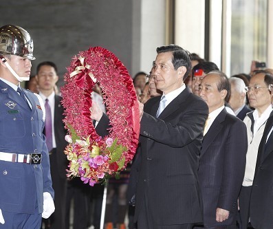 马英九向孙中山铜像献花致敬。(图片来自网络)