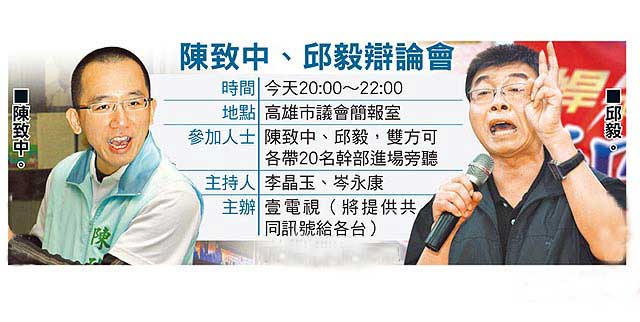 报道指出,壹电视邀请邱毅及陈致中电视辩论,原定上周四晚上在高雄市前镇宪德宫广场举办,因警方担心冲突,未准许集会;壹电视再协调,当晚三方达成共识改到高雄市劳工公园大礼堂。但邱毅昨发声明,高雄市议长许崑源已商借高雄市议会会议厅为辩论场所,且辩论会不应由一家媒体垄断,应开放所有媒体均可采访转播。