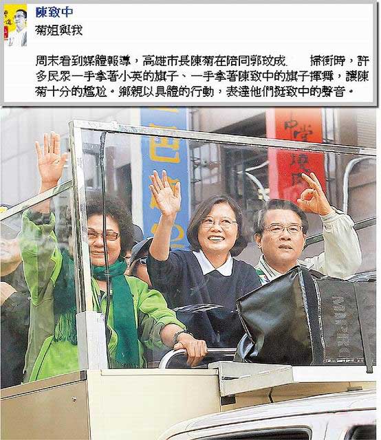 陈致中在文中指出,2006年,他在美国留学时,太太黄睿靓怀孕,陈水扁叫他回来帮陈菊助选,还说:(民进党)新潮流派系看陈菊的选情不好,已将人力财力都撤出陈菊总部了。他和黄睿靓冒险回台为她(陈菊)站台,陈水扁还出钱出力在选前办“牵手护爱河”活动,陈菊这才惊险当选。