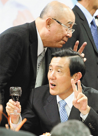 国民党中央党部昨晚举行尾牙,国民党主席马英九(前)和吴伯雄(后)敬酒时,不忘比出二号手势。