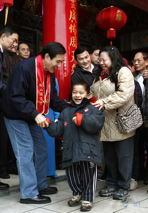 今日,马英九在台北市长郝龙斌的陪同下,前往松山慈惠堂参拜,祈福参拜。一早就有超过500名民众携家带眷冒雨排队,等着从马英九手中领取新春福袋讨吉利。面对大排长龙的民众,马英九发福袋身手利落,1分钟发出超过30个福袋,同时与民众一一握手亲切寒暄。