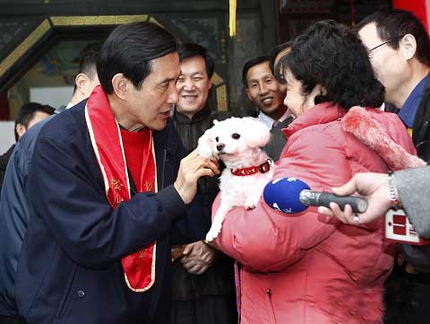 中国台湾网1月25日消息 据台湾媒体报道,今天大年初三,马英九身穿红色毛衣、牛仔裤赴松山慈惠堂祈福参拜,半小时内发出近千个新春福袋,亲切与民众互动,带狗的民众人狗有份,并开玩笑对狗儿说“这是马小九给你的”;对于媒体询问台当局行政主管部门团队改组的问题,马英九笑而未答。