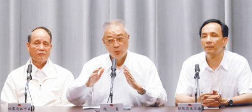 吴敦义(中)、朱立伦(右)与林中森(左),曾被视为台当局行政主管部门铁三角。(图片来源于:台湾《联合报》)