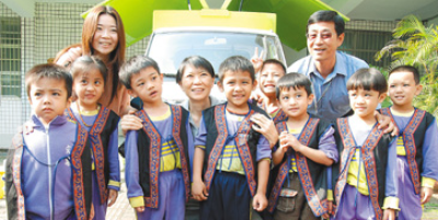 周美青昨天走访屏东县偏僻乡镇的小学时,跟小朋友们的合影。(图片来源于:台湾《联合报》)