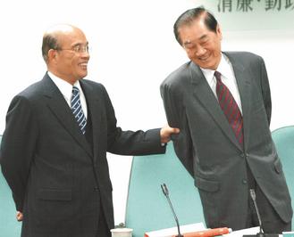 陈唐山(右)8日呼吁,选过正、副台湾地区领导人的人,不该再出来了,外界解读暗批苏贞昌(左)。对照两人昔日在民进党中常会中有说有笑,形成强烈对比。 来源:台湾《联合报》