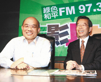 主持电台节目的长谢长廷(右),昨天邀参选民进党主席的苏贞昌(左)接受访问,两人互动和乐。(图片来源:台湾《联合报》)