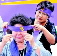 民进党昨519游行誓师,台北市议员徐佳青(右)帮代理主席陈菊(左)绑布条,不小心遮住陈菊的眼睛。(图片来源:台湾《联合报》)