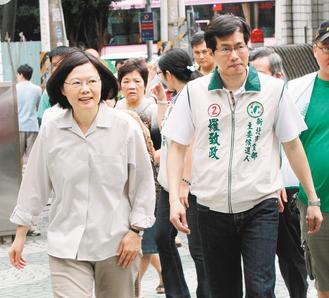 民进党昨日举行“四合一”选举,前主席蔡英文(左)一早由新北市主委候选人罗致政(右)陪同投票。(图片来源:台湾《联合报》)