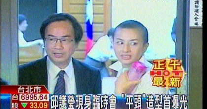 民进党“立委”邱议莹摘掉头巾,今首次以平头造型现身。(来源:台湾TVBS电视台)