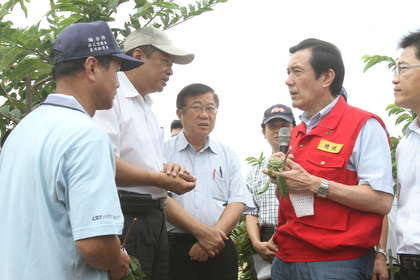 马英九到台东知本了解释迦、香蕉等作物受害情形,指示补助从速、认定从宽、程序从简等原则,助农民度过难关。(中国台湾网 周剑)