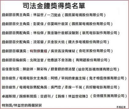 网友眼见这场好戏,立马制作司法金钟得奖名单,林益世以《一刀毙命》获“戏剧节目男主角奖”,彭爱佳以《你要喝什么茶》获最佳女主角,林仙保以《我重听什么都没听到》获最佳男配角,沈若兰则以《美金放火烧》获女配角奖。
