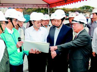 马英九在多名官员陪同下,前往料罗码头到金门医院视察施工进度,并与多位乡、镇长及里长座谈。