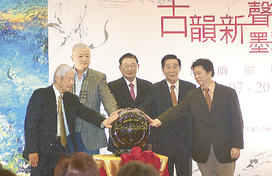 “古蕴新生·墨彩华章”两岸书画展昨天在台北圆山饭店开幕,前海基会董事长江丙坤(中)、陕西省西安美院国画系主任姜怡翔(左二)、台湾油画大师陈景容(左一)、中华经贸文创交流协会理事长江清香兼、艺术家刘俊成(右一)等人共同启动。(来源:台湾《旺报》)
