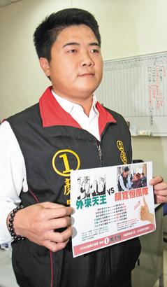 颜宽恒拿着文宣表示,希望民进党外来的天王们不要打他们父子。图自台湾《联合报》