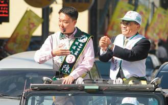 民进党主席苏贞昌(右)昨天专程南下到台中乌日区,陪同“立委”候选人陈世凯(左)拜票。图自台湾《联合报》