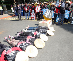 台湾关厂工人社团演出行动剧表达诉求。(图片来自台媒)