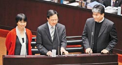 针对“通奸除罪化”议题,台当局“文化部长”龙应台(左)15日在“立法院”答询中表示支持,“行政院长”江宜桦(中)认为可以讨论,“内政部长”李鸿源(右)则显得有些尴尬地表示,他没个人看法。(来源:台湾《中国时报》)
