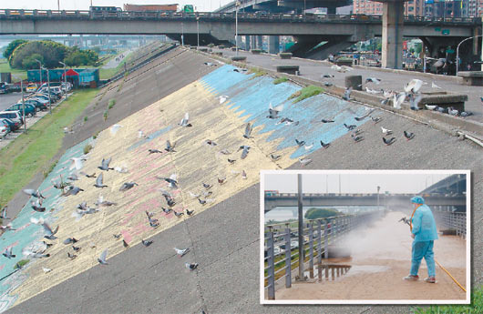 忠孝码头堤防一带野鸽群集,新北市农业局派员前往消毒,加强防范H7N9禽流感。 (图片来源:台湾《联合报》)
