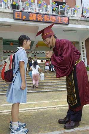 据台湾《中国时报》报道,台北市开学首日志清小学校长穿着古代夫子装,站在校门口,迎接小朋友到校上课。图为身穿古装的校长正跟小朋友打躬作揖,模样非常逗趣。