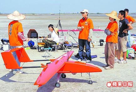 台湾成功大学无人飞机“黑面琵鹭号”,昨在台南县七股乡海边空地上准备升空。来源:台湾《苹果日报》