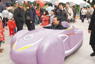 台湾明道大学研发氢能燃料电池车在“国际燃料电池车观摩会”上现身相当显眼,该校校长汪大永在广场试乘时,引起瞩目。图片来源:台湾《联合报》