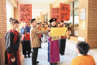 “校长干嘛要穿殭尸装?”被吵醒的学生好奇地问,“不是啦!那是清代官服啦!”学生们看到得奖学生真的跪地接旨,江家珩宣读“诏书”时,可让老师、学生们High翻天!