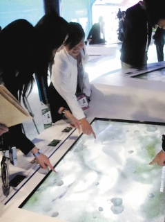 游客在世博会台北案例馆互动体验区,认识台北淡水河特有的鱼、蟹,用手触动,鱼儿会聚集,螃蟹则往石头里躲,生动有趣。 来源:台湾《联合晚报》