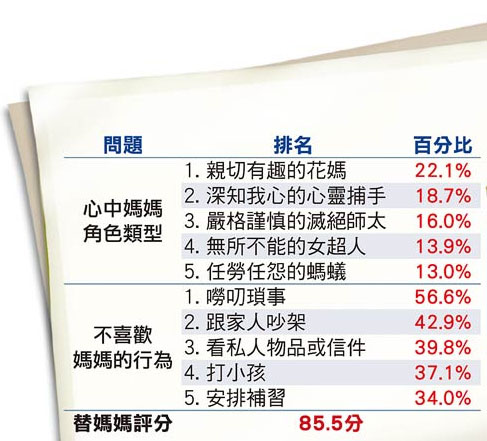 中国台湾网5月4日消息 据台湾《苹果日报》报道,母亲节前夕,一项针对台湾高雄市中小学生对母亲印象的调查显示,妈妈在孩子心中得到85.5分的高分;22%的小朋友认为自己的妈妈像卡通《我们这一家》中亲切有趣的“花妈”,却也有16%的学童认为妈妈像金庸作品《倚天屠龙记》中的“灭绝师太”。而最讨厌妈妈的行为为唠叨、查看私人信件与干涉交友。
