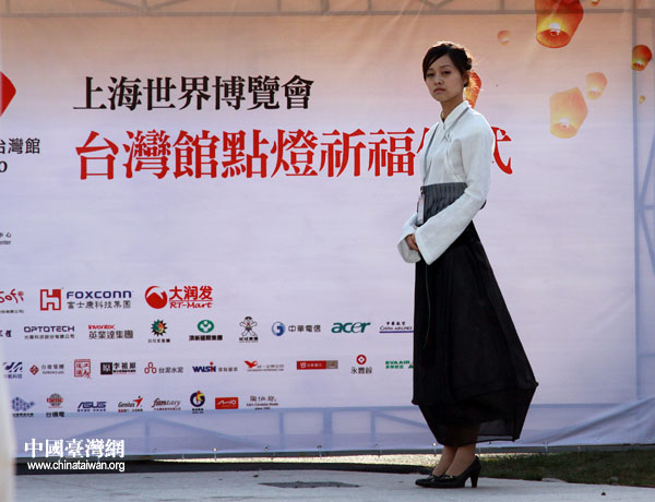 中国台湾网5月12日 上海世博会台湾馆11日举行盛大天灯祈福仪式。台湾馆20余位亲善领航员当日“改头换面”,褪下往日制服,穿上典雅端庄充满浓浓中国味的“天灯服”,成为现场焦点。