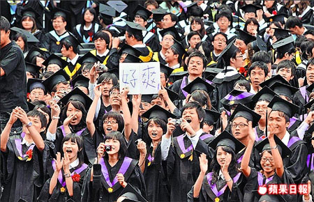 台大举行毕业典礼,毕业生高举“好爽”的牌子表达愉悦心情。 来源:台湾《苹果日报》