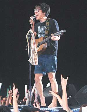 天气太热,歌手卢广仲干脆脱掉鞋子献唱,炒热现场气氛。图片来源:台湾《联合报》