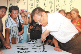 中国台湾网7月12日消息 据台湾《联合报》报道,大陆著名无臂书法家郑阶平,特别委托台湾资深军事记者姚琢奇,将亲笔挥毫的字画“中华久远”转赠马英九。姚琢奇转述郑阶平的话说,“希望中华文化源远流长”。