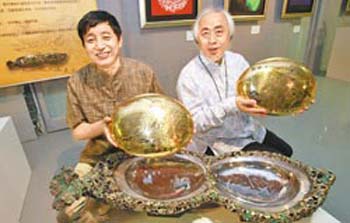 “熔炼之舞--朱炳仁、杨奉琛两岸双人艺术展”22日在华山艺文特区开展,朱炳仁(左)、杨奉琛(右)两人拿著《本是同根生》铜铸作品。图片来源:台湾《中国时报》