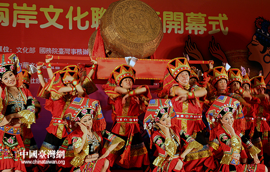 “情系八桂——两岸文化联谊行”联欢晚会16日晚在南宁举行,图为广西少数民族迎宾表演。(中国台湾网 张弛 摄)