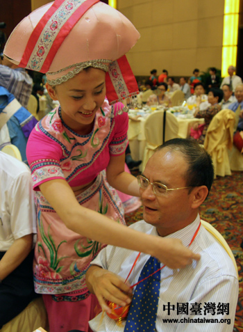 “情系八桂——两岸文化联谊行”联欢晚会16日晚在南宁举行,图为壮族姑娘为台湾嘉宾送上寓意友谊长久的“绣球”。(中国台湾网 张弛 摄)