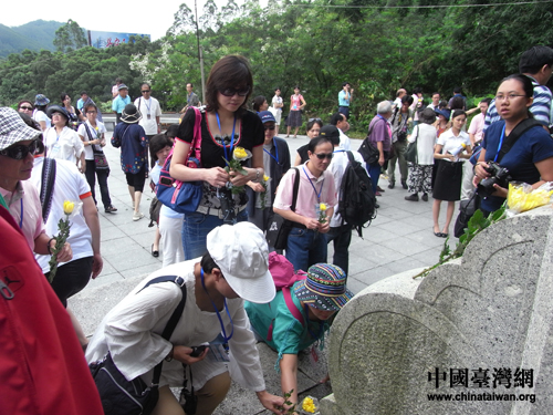 参加“情系八桂-两岸文化联谊行”活动的嘉宾今天来到昆仑关战役旧址悼念先烈。图为两岸嘉宾在纪念牌坊前敬献菊花。(中国台湾网 张弛 摄)