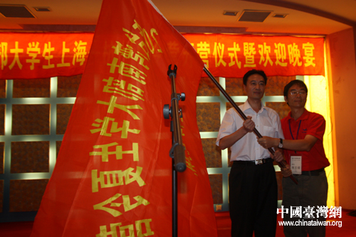 国台办交流局副局长严中洲为夏令营团长陈宗韩授旗。(中国台湾网 肖燕 摄)