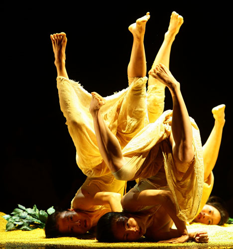 云门舞集“流浪者之歌”10日举行彩排记者会,舞台上的黄金稻米配合舞者的肢体动作,编织成一幕幕黄金之舞。 图片来源:“中央社”