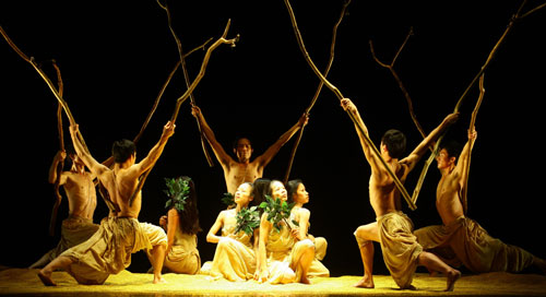 云门舞集“流浪者之歌”10日举行彩排记者会,舞台上的黄金稻米配合舞者的肢体动作,编织成一幕幕黄金之舞。 图片来源:“中央社”