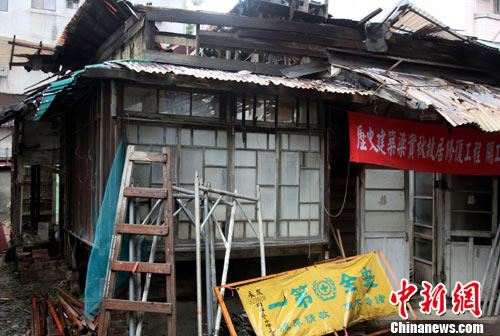 一代文坛名流梁实秋生前在台居住地——位于台北市云和街上的“雅舍”旧居,经岁月消磨,早已残败不堪。2003年被台北市政府指定为“历史建筑”后,又经多年踟蹰,终于在不久前开始动工修复。图为11月16日所见修复工程现场情景。中新社记者 王健 摄