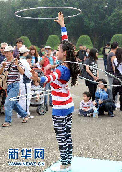 11月21日,一名街头艺人在表演特技呼拉圈。新华社发(吴景腾 摄)